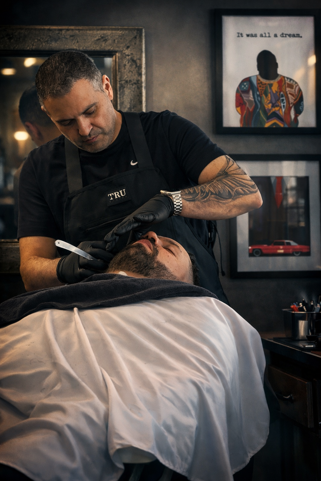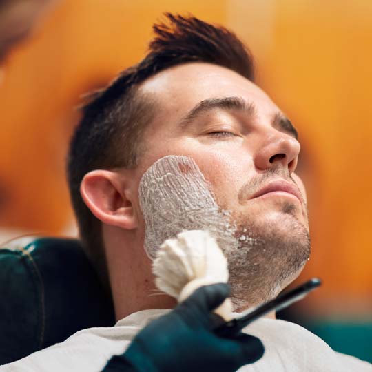 A traditional straight razor shave featuring steam towels, hot lather, and precise technique. Includes a gentle cleanser and moisturizer to leave your skin smooth, hydrated, and refreshed. Finished with a straight razor hot lather neck shave for the perfect touch.
